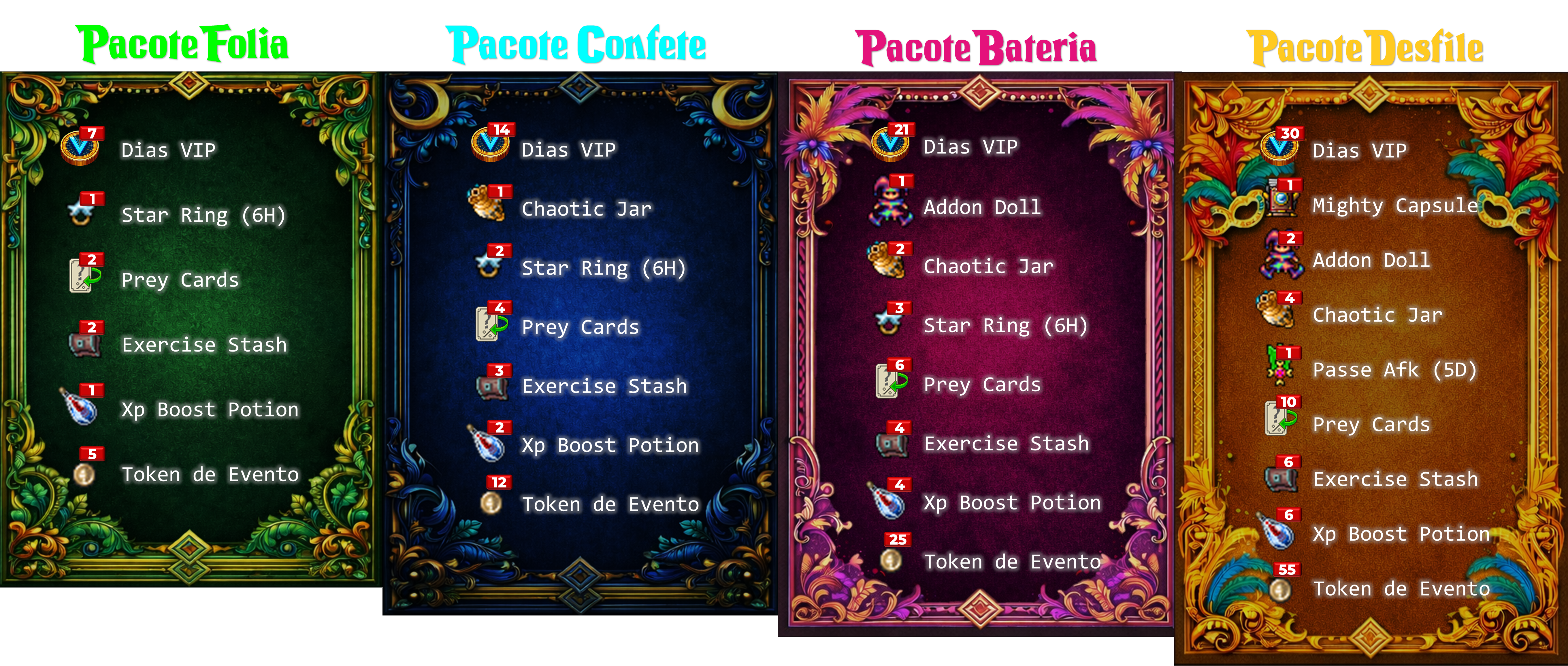 Pacotes de Carnaval Além do evento, entre os dias 05 e 20 de fevereiro o CrandoriaOT disponibilizará acesso a quatro Pacotes de Carnaval, com período VIP e muitos itens especiais! Para mais informações, clique nas imagens.